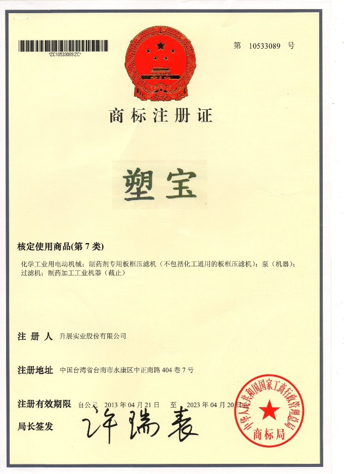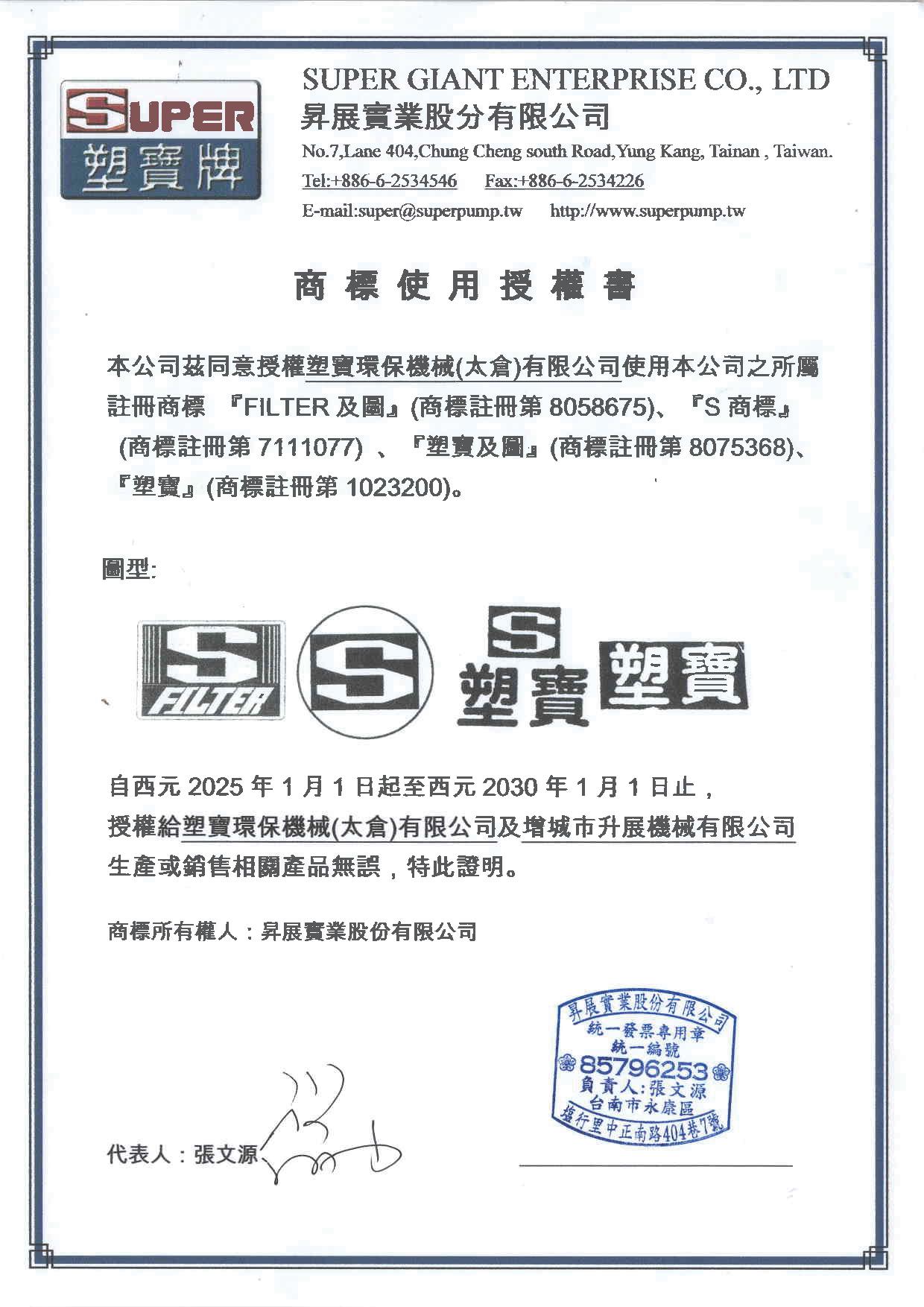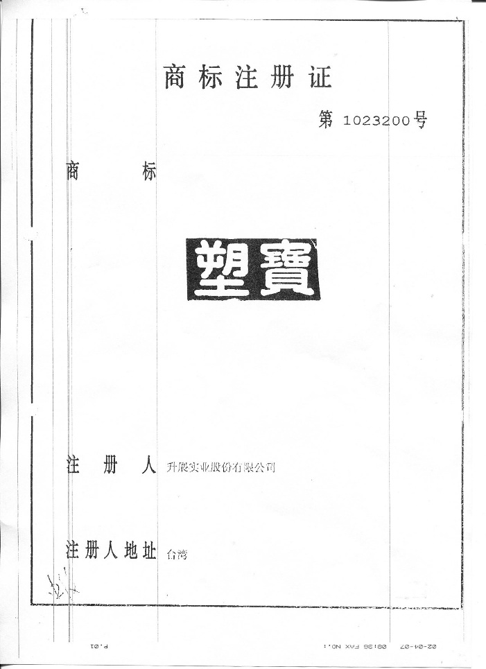 下列各式商標(biāo)為本公司于大陸取得之商標(biāo)注冊,僅授權(quán)太倉市塑寶環(huán)保機械及增城市升展機械公司使用,其余非經(jīng)我司書面許可而濫用者,本公司將采取法律行動,追索侵權(quán)之損害賠償。